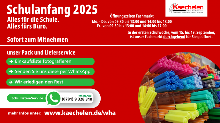 In der ersten Schulwoche, vom 15. bis 19. September ist unser Fachmarkt durchgehend für Sie geöffnet.